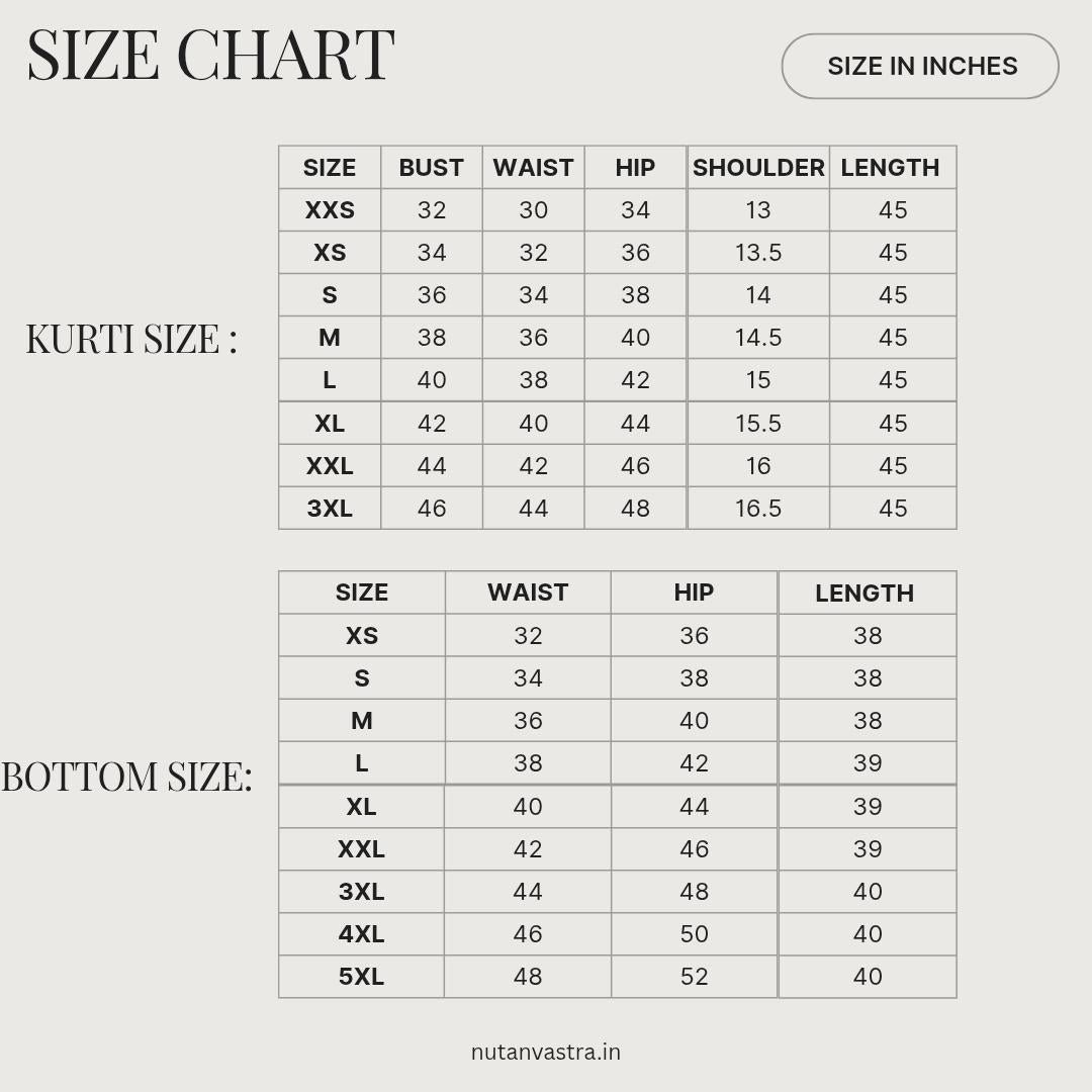 Suggestion: If you wear 36B bra then select 38 (M) size for fitted kurta and 40 (L) size for loose fitting.